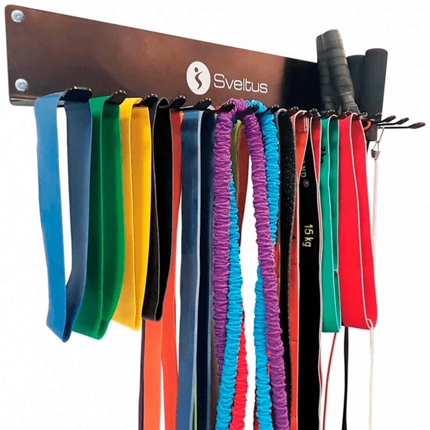 Sveltus- seinäteline hyppynaruille ja kuminauhoille on edullinen ratkaisu pitämään kuntoiluvälineet järjestyksessä. Seinätelineessä on 17 koukkua hyppynarujen, kuminauhojen ja muiden välineiden säilyttämiseen. Mukana toimitetaan neljä kiinnitysruuvia.