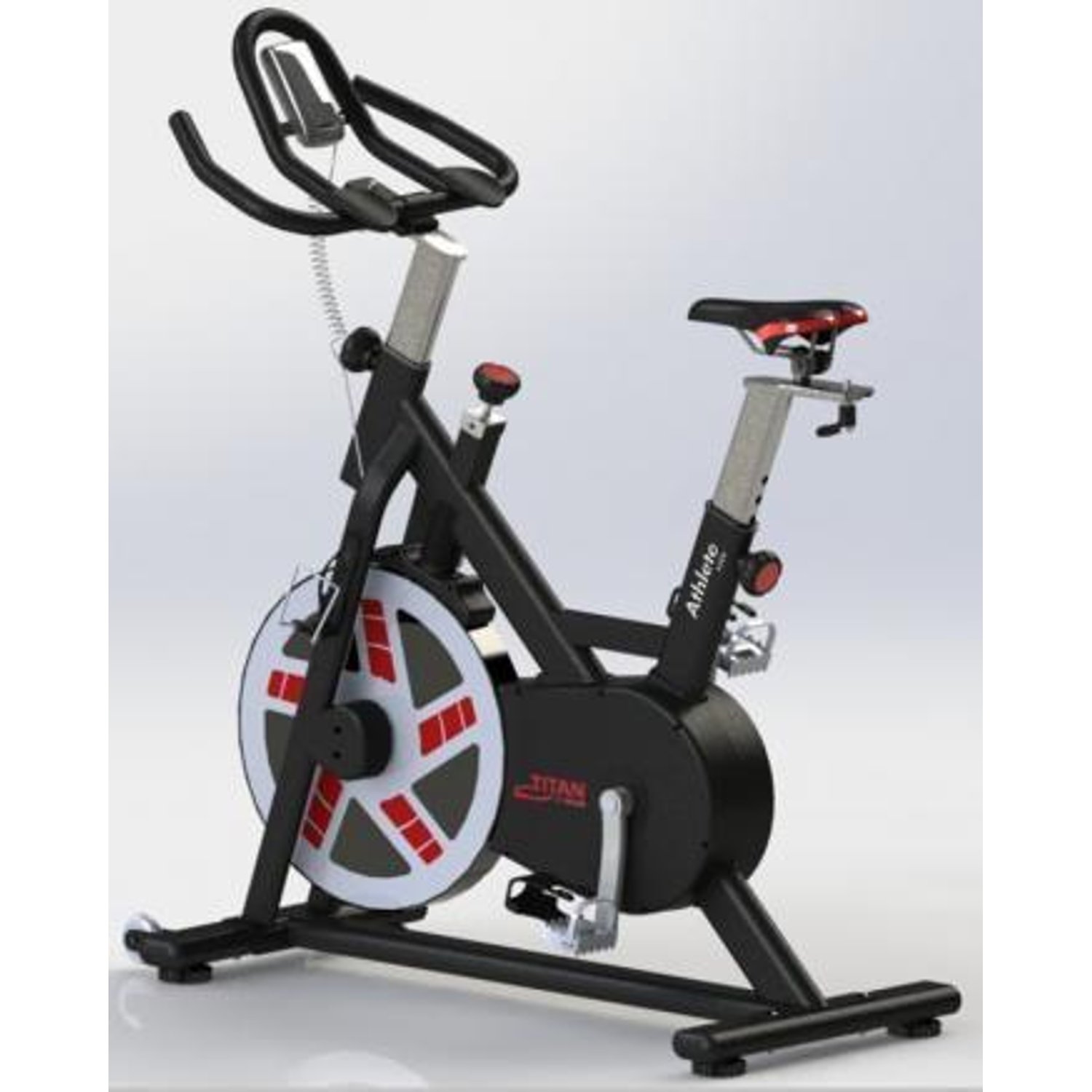 nousua ja tekee menosta vakaata. Mattamusta pohjaväri ja punaiset yksityiskohdat antavat Titan Athlete spinningpyörälle säväkän ulkonäön.